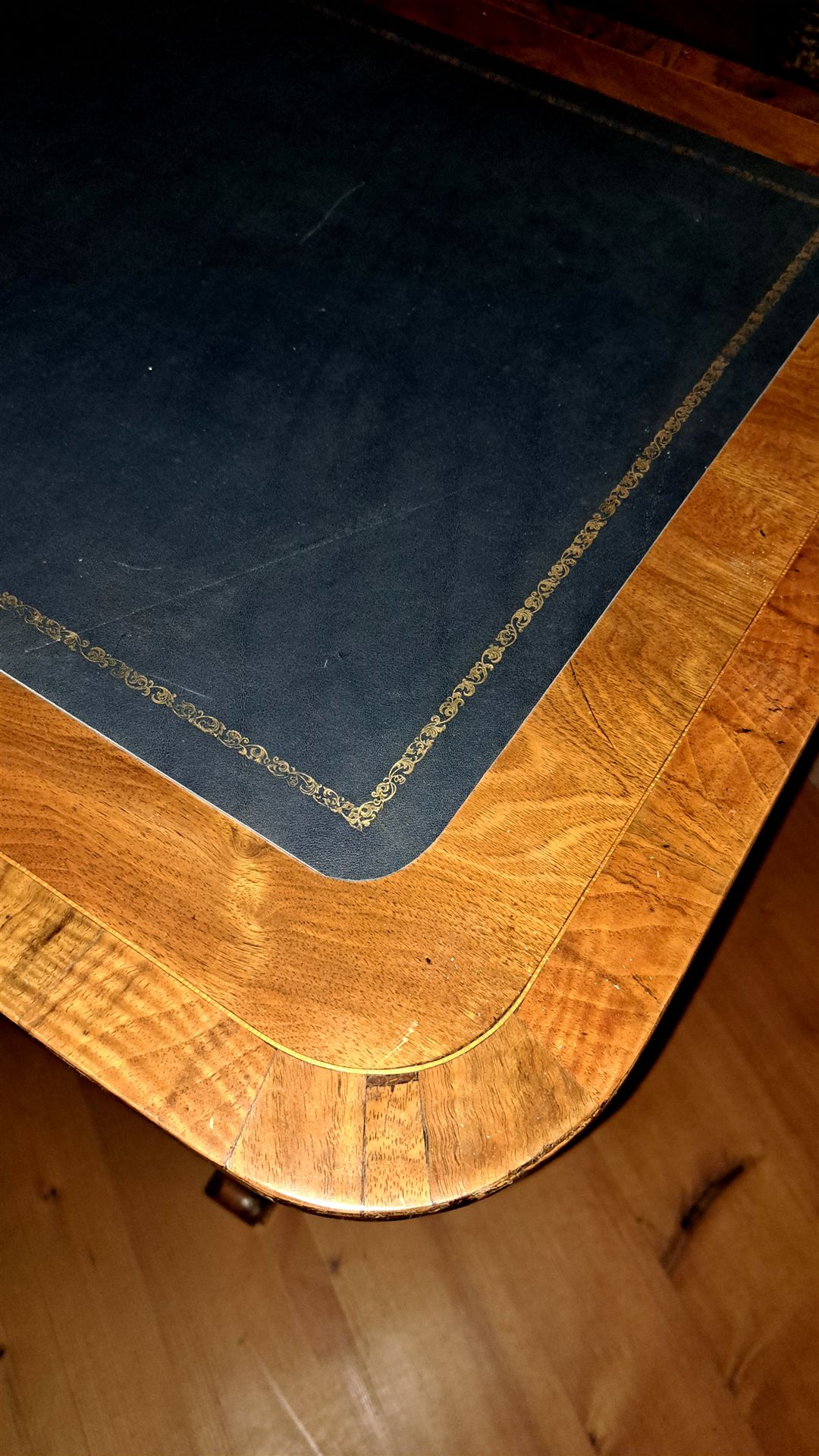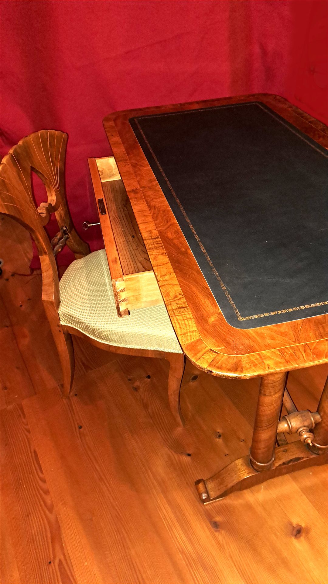 Mit Lederbelag und Goldprägung. Nussbaumholz furniert mit Buchsbaum-Filet-Intarsien im Tisch und Stuhl.