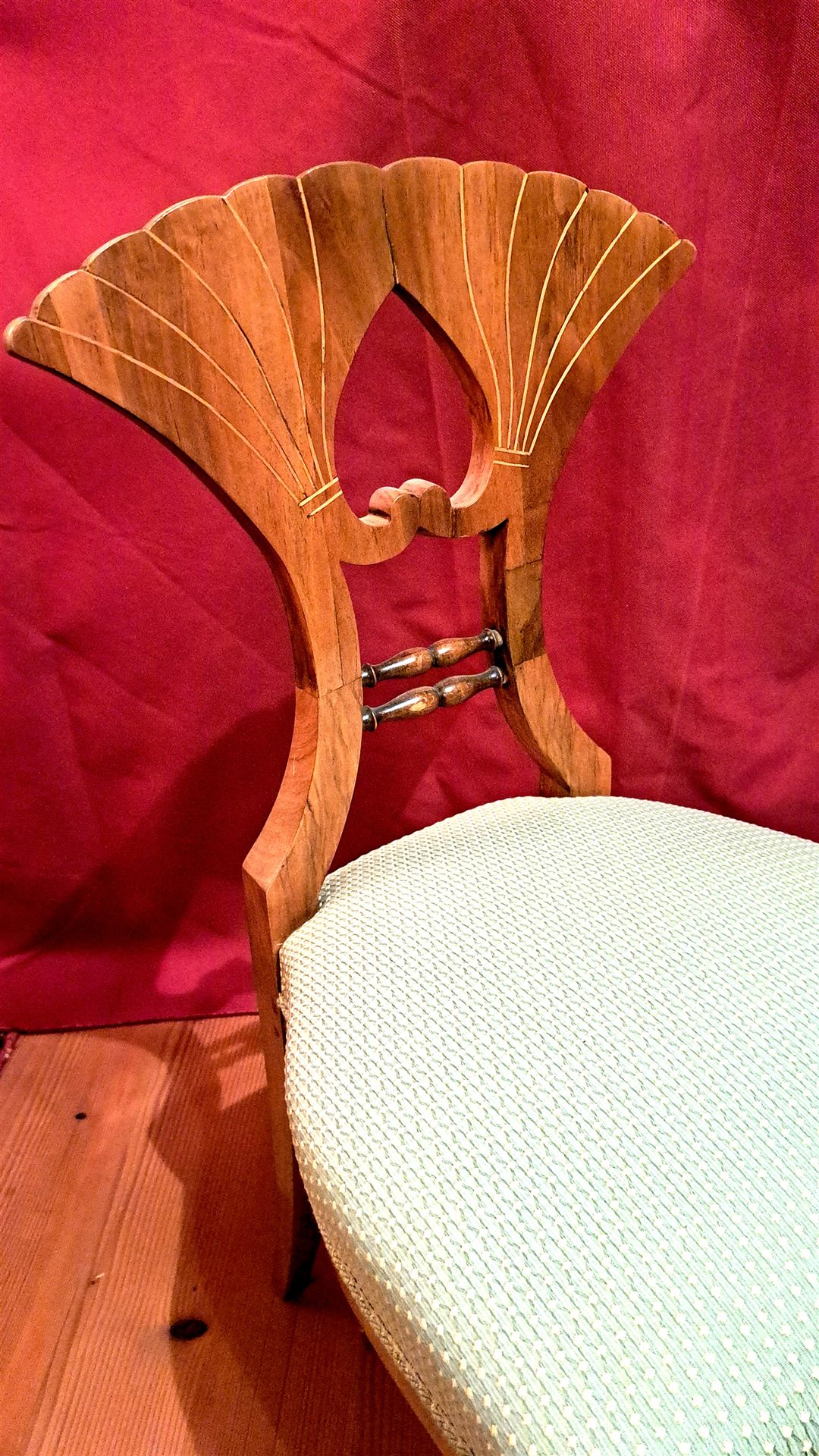 Konventionell gepolsterter Stuhl mit Lehne in Form eines Ginkoblattes.
