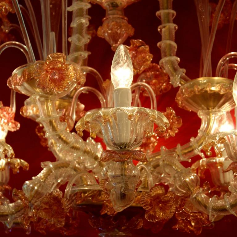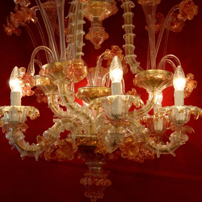 Romantischer, grosser Murano-Leuchter 6-armig: Klares und zartrosa-gefärbtes Glas mit Blattgold, verspielte Dekoelemente auf mehreren Ebenen.